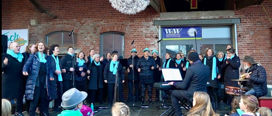 Wir sind zum ersten Mal dabei gewesen und haben mit vier weiteren Chören das Rahmenprogramm des Weihnachtsmarktes gestaltet.